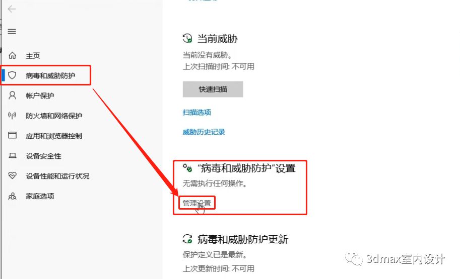 4、进入病毒和威胁防护界面,点击左侧的病毒和威胁防护,再点击右侧的“病毒和威胁防护”设置下面的【管理设置】;